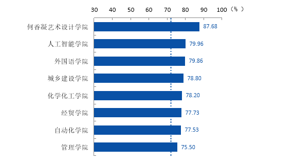 参评率较高的是何香凝艺术设计学院(87.68%)、人工智能学院(79.96%)、外国语学院(79.86%),参评率较低的学院是园艺园林学院(57.97%)、轻工食品学院(58.18%)、动物科技学院(60.76%)。各学院应加强评教工作的宣传,提高学生对教学评价在教学改进中意义和价值的认识,以进一步提升学生参与评教的积极性。