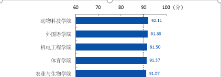 动物科技学院的平均得分最高,为92.11分,得分最低的是马克思主义学院,平均得分87.70分。以下是各学院的得分情况如图7所示: